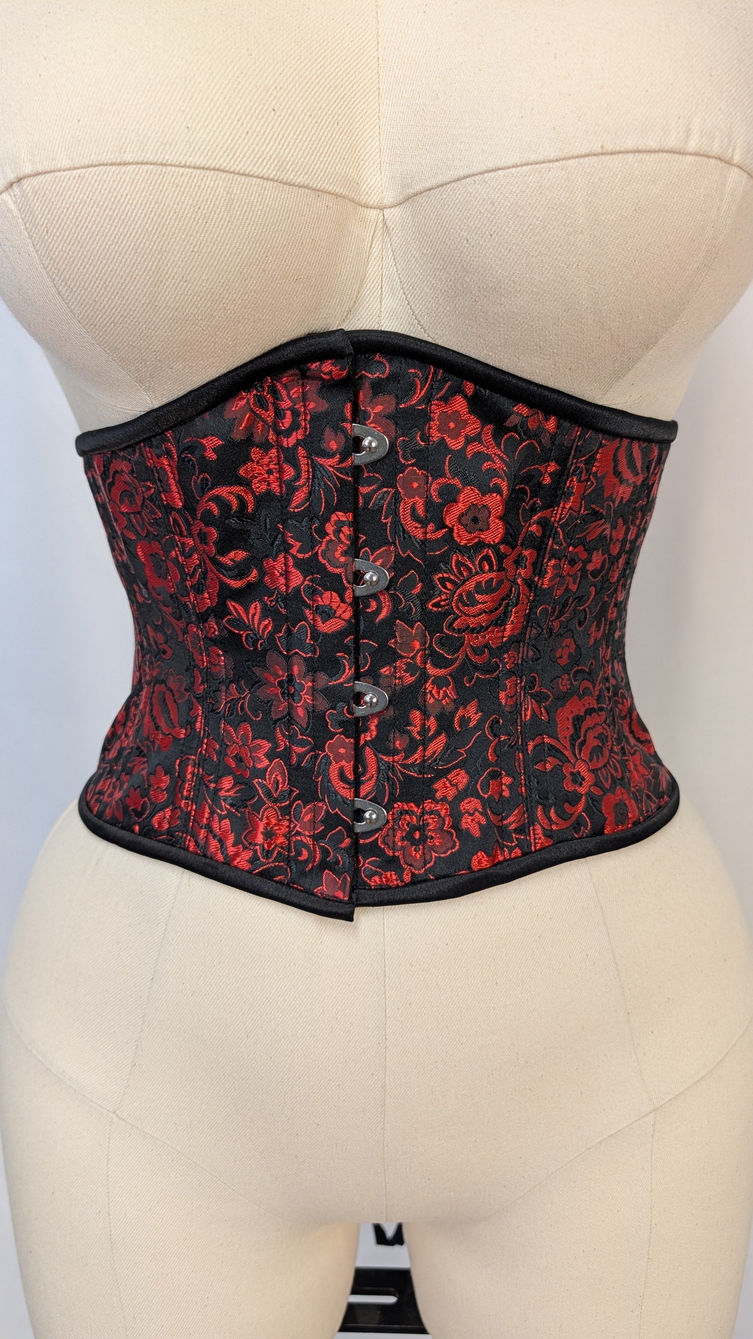This listing is for a made to order corset made using our custom pattern! Constructed from a black and red floral brocade with a cotton twill liner, this corset is perfect for victorians, goths, and the ren faire alike. This corset is made of a black and red floral brocade, with black satin binding, black laces, nickel colored hardware, and a floating boned lacing panel.