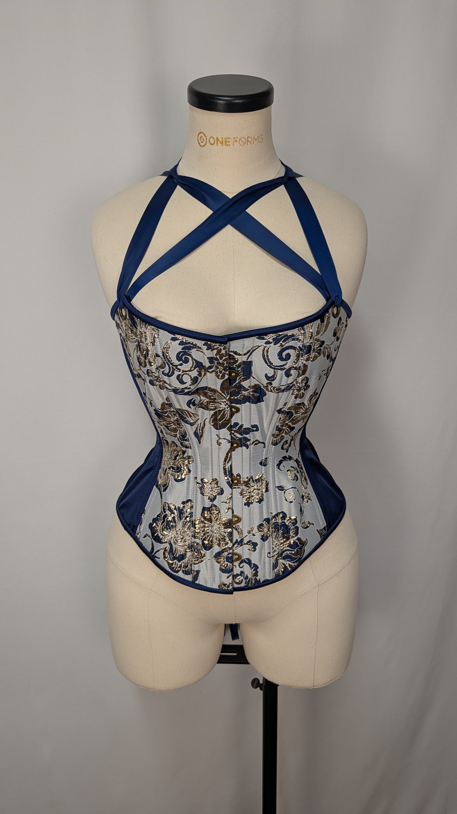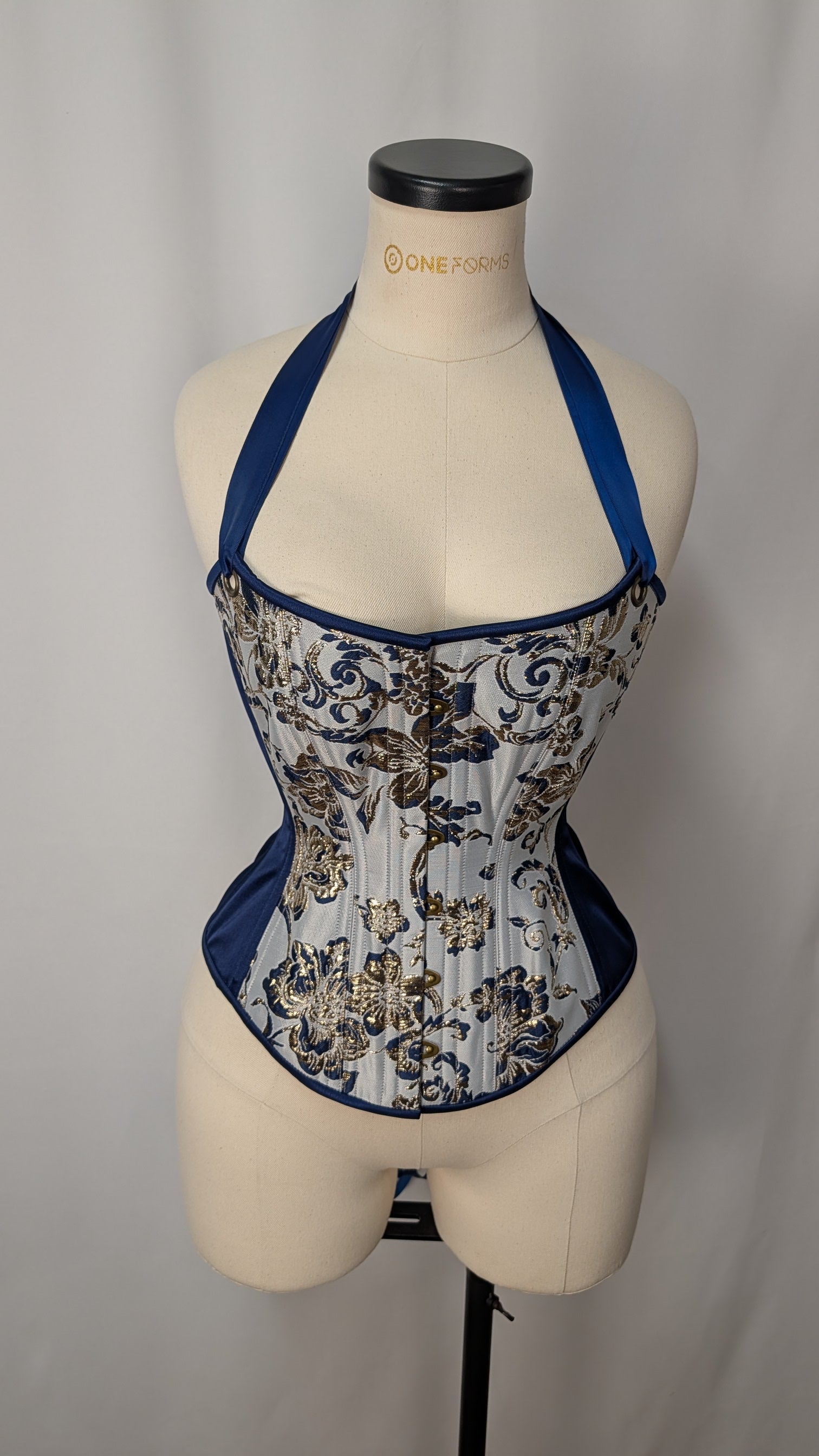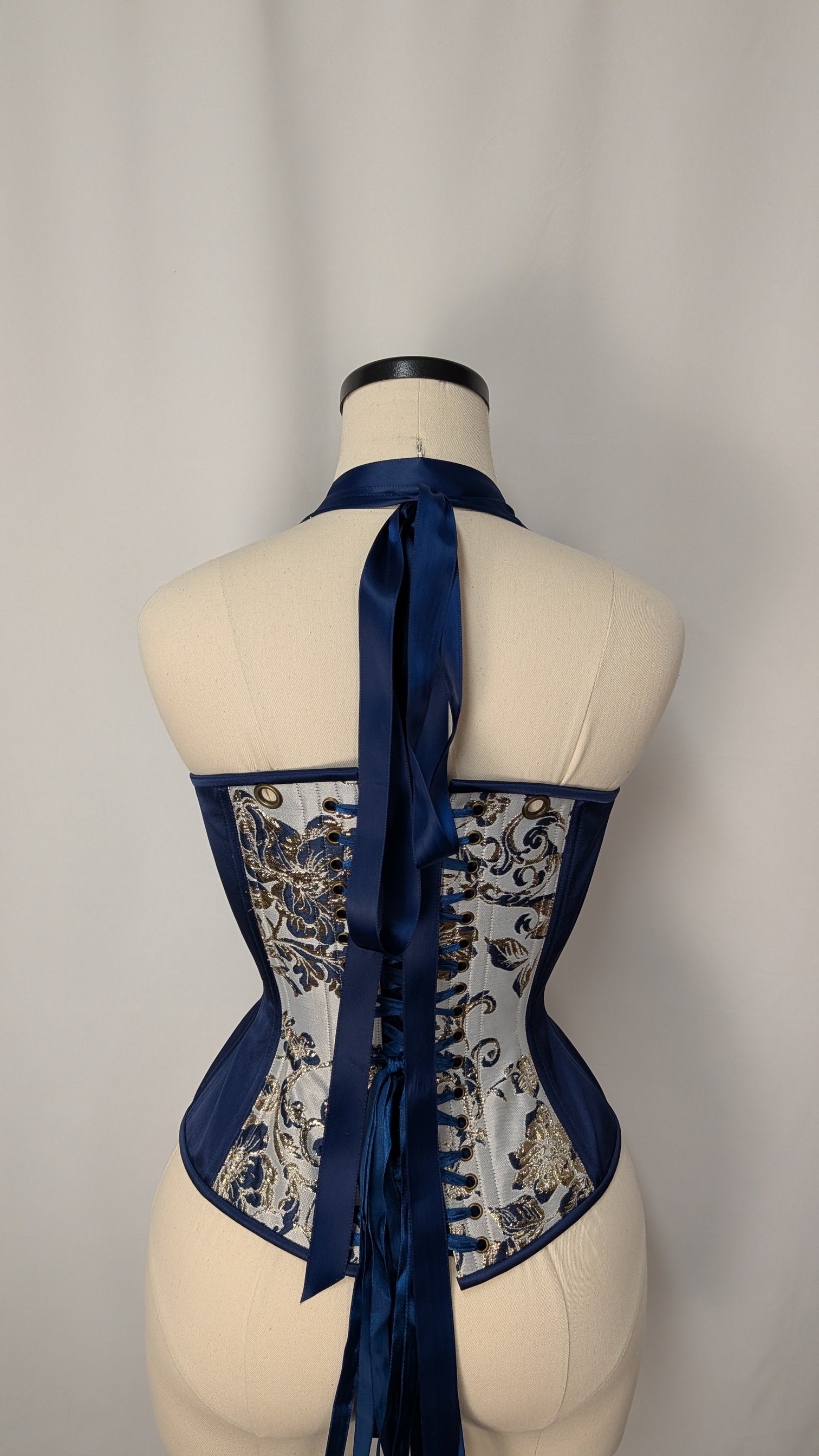 This listing is for an made to order corset using our custom pattern! Constructed from a stunning floral silk jacquard, with matching navy satin insert panels, and a cotton twill liner, this corset is perfect for victorians and goths alike. This corset is made of a stunnyinh beige, grey, gold, and navy metallic jacquard, tied together with matching binding, stitching, and laces, bronze colored hardware, and a coordinating satin boned lacing panel.